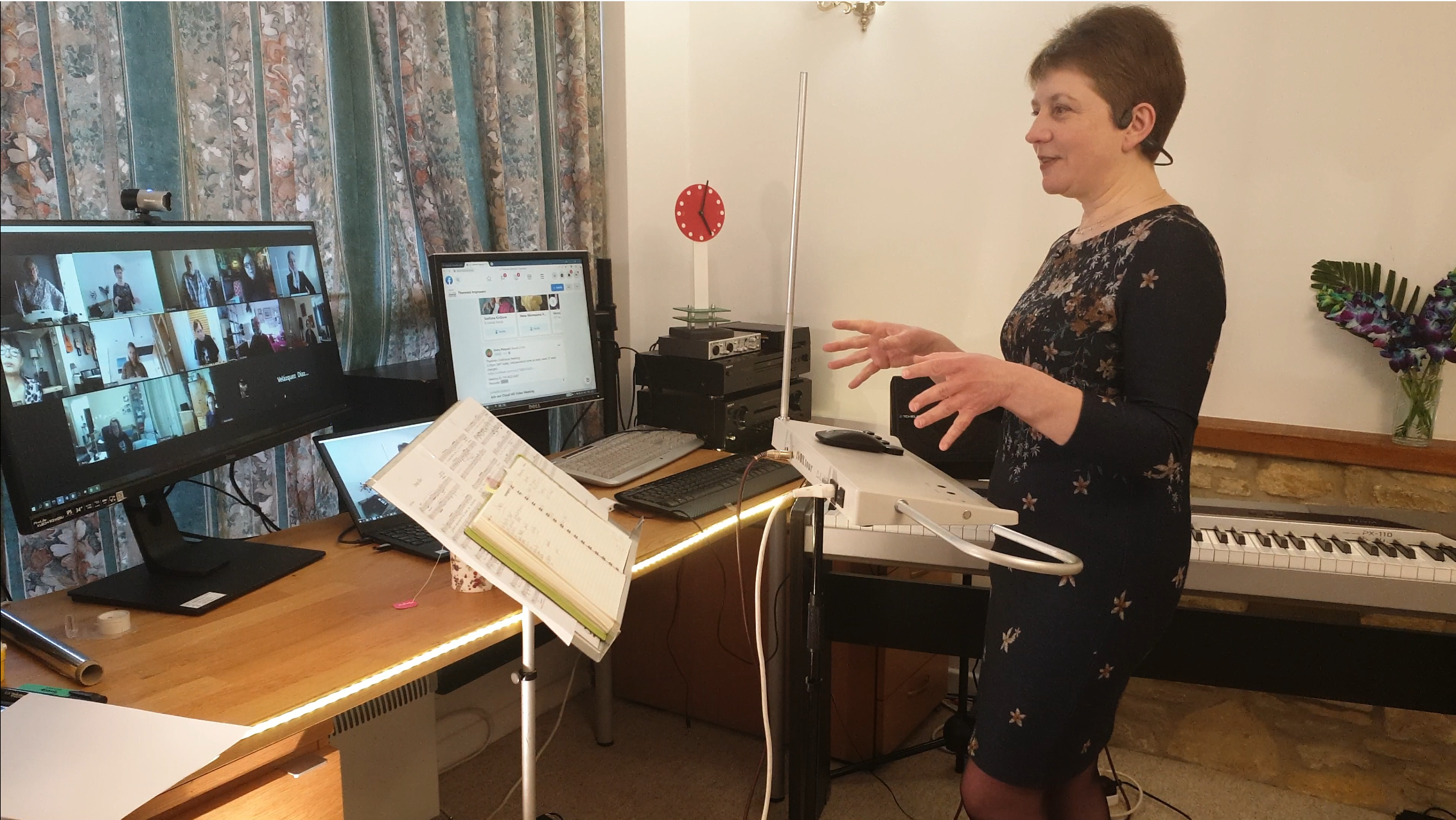 Lydia Kavina in front of multiple screens teaching to play the theremin in online workshop